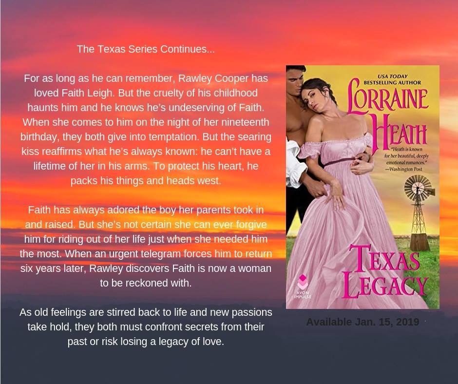 What a gift to fans of this series! TEXAS LEGACY is the long-awaited concluding novella to Lorraine Heath’s Texas Trilogy. The first book in the series, TEXAS DESTINY was initially published in 1997 (!?!?), but Ms. Heath slid readers back into her Texas world as you would slip into an old, worn-in pair of cowboy boots. This long novella follows Cordelia and Dallas’ daughter Faith and the boy, now a man, Rawley, who they took in years before.